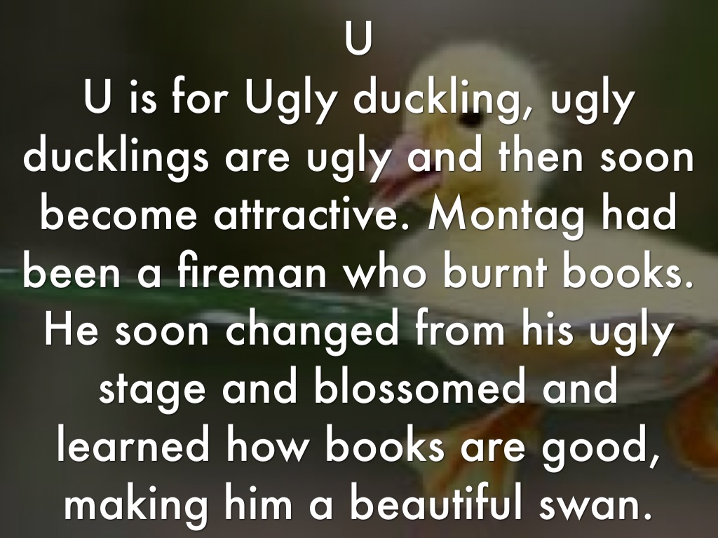 U is for Ugly duckling, ugly ducklings are ugly and then soon become attractive. Montag had been a fireman who burnt books. He soon changed from his ugly stage and blossomed and learned how books are good, making him a beautiful swan.