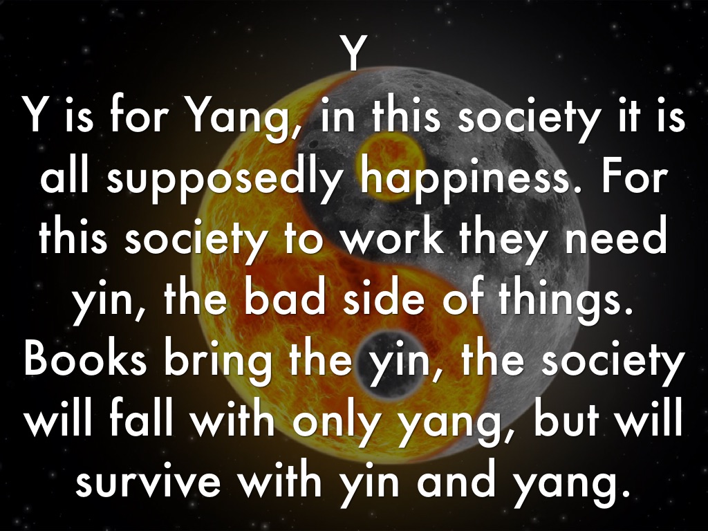 Y is for Yang, in this society it is all supposedly happiness. For this society to work they need yin, the bad side of things. Books bring the yin, the society will fall with only yang, but will survive with yin and yang.