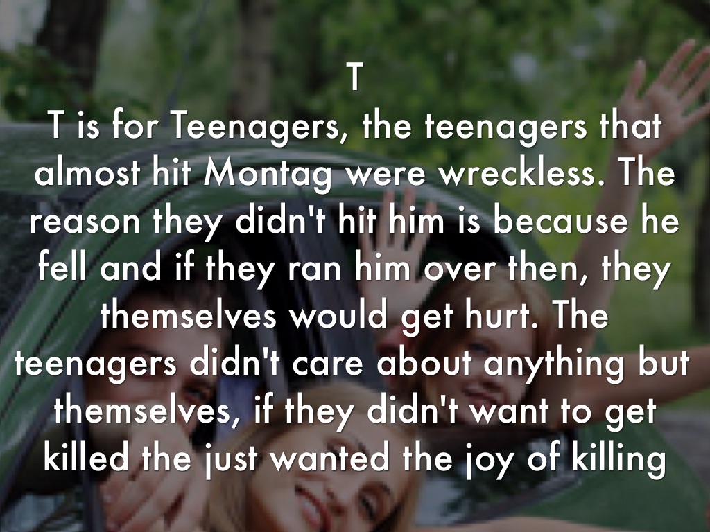 T is for Teenagers, the teenagers that almost hit Montag were wreckless. The reason they didn't hit him is because he fell and if they ran him over then, they themselves would get hurt. The teenagers didn't care about anything but themselves, if they didn't want to get killed the just wanted the joy of killing