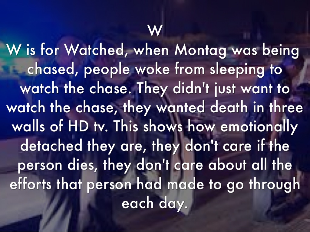 W is for Watched, when Montag was being chased, people woke from sleeping to watch the chase. They didn't just want to watch the chase, they wanted death in three walls of HD tv. This shows how emotionally detached they are, they don't care if the person dies, they don't care about all the efforts that person had made to go through each day.