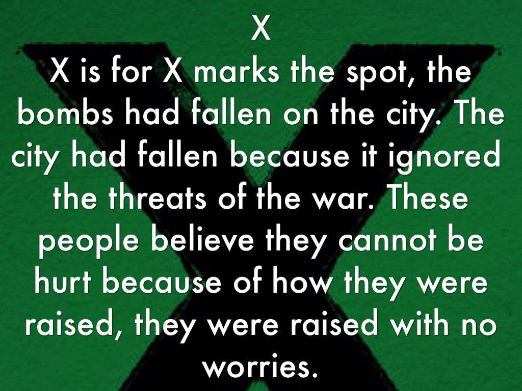 X is for X marks the spot, the bombs had fallen on the city. The city had fallen because it ignored the threats of the war. These people believe they cannot be hurt because of how they were raised, they were raised with no worries.