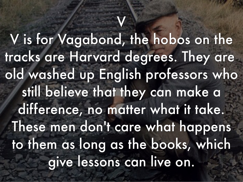 V is for Vagabond, the hobos on the tracks are Harvard degrees. They are old washed up English professors who still believe that they can make a difference, no matter what it take. These men don't care what happens to them as long as the books, which give lessons can live on.