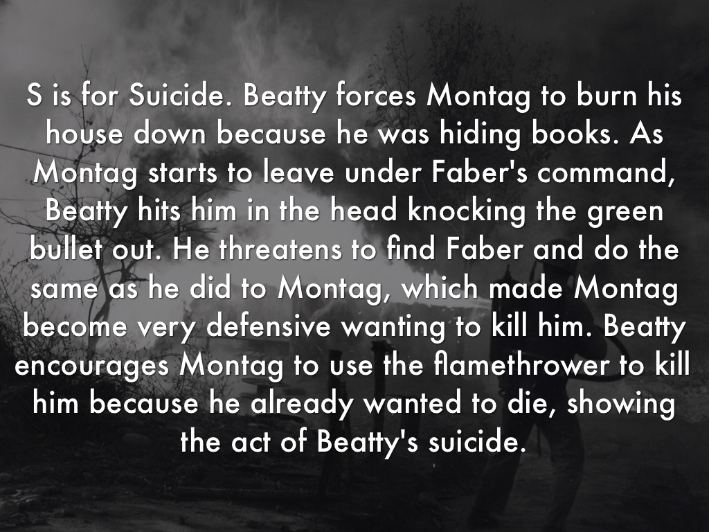S is for Suicide. Beatty forces Montag to burn his house down because he was hiding books. As Montag starts to leave under Faber's command, Beatty hits him in the head knocking the green bullet out. He threatens to find Faber and do the same as he did to Montag, which made Montag become very defensive wanting to kill him. Beatty encourages Montag to use the flamethrower to kill him because he already wanted to die, showing the act of Beatty's suicide.