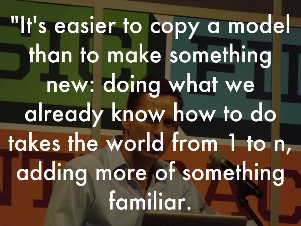 "It's easier to copy a model than to make something new: doing what we already know how to do takes the world from 1 to n, adding more of something familiar.