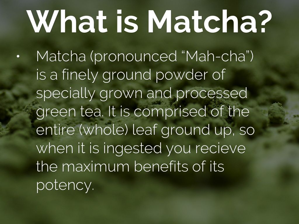 Matcha (pronounced “Mah-cha”) is a finely ground powder of specially grown and processed green tea. It is comprised of the entire (whole) leaf ground up, so when it is ingested you recieve the maximum benefits of its potency.