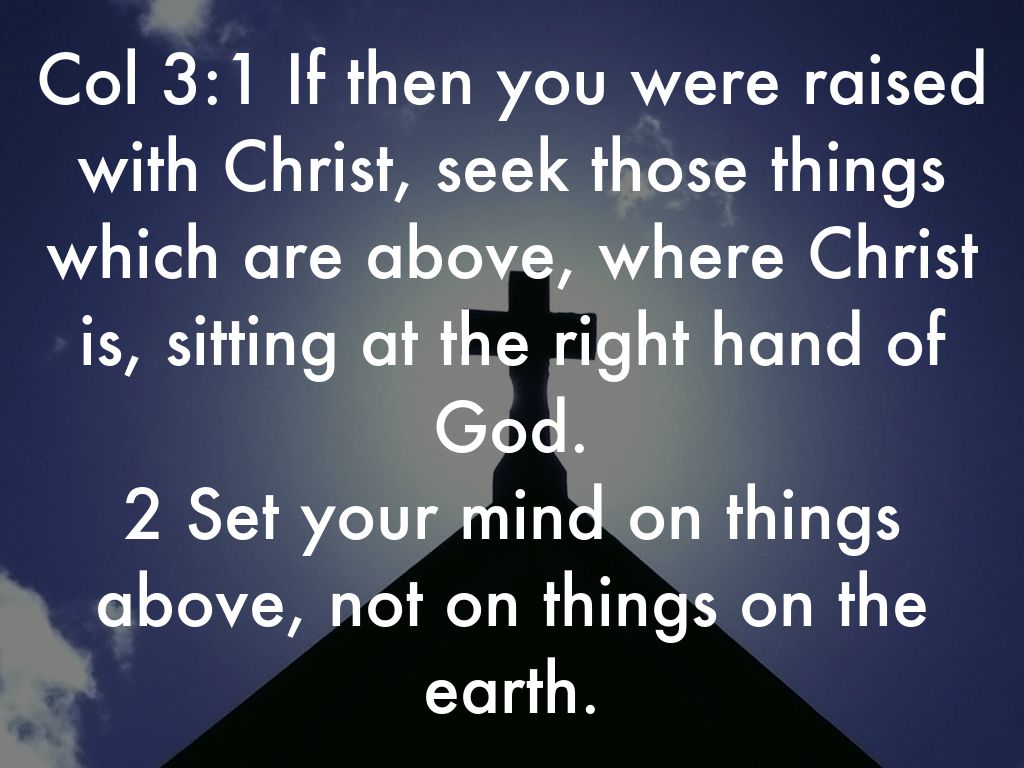Col 3:1 If then you were raised with Christ, seek those things which are above, where Christ is, sitting at the right hand of God. 2 Set your mind on things above, not on things on the earth.