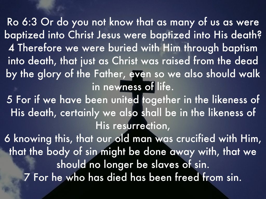 Ro 6:3 Or do you not know that as many of us as were baptized into Christ Jesus were baptized into His death? 4 Therefore we were buried with Him through baptism into death, that just as Christ was raised from the dead by the glory of the Father, even so we also should walk in newness of life. 5 For if we have been united together in the likeness of His death, certainly we also shall be in the likeness of His resurrection, 6 knowing this, that our old man was crucified with Him, that the body of sin might be done away with, that we should no longer be slaves of sin. 7 For he who has died has been freed from sin.