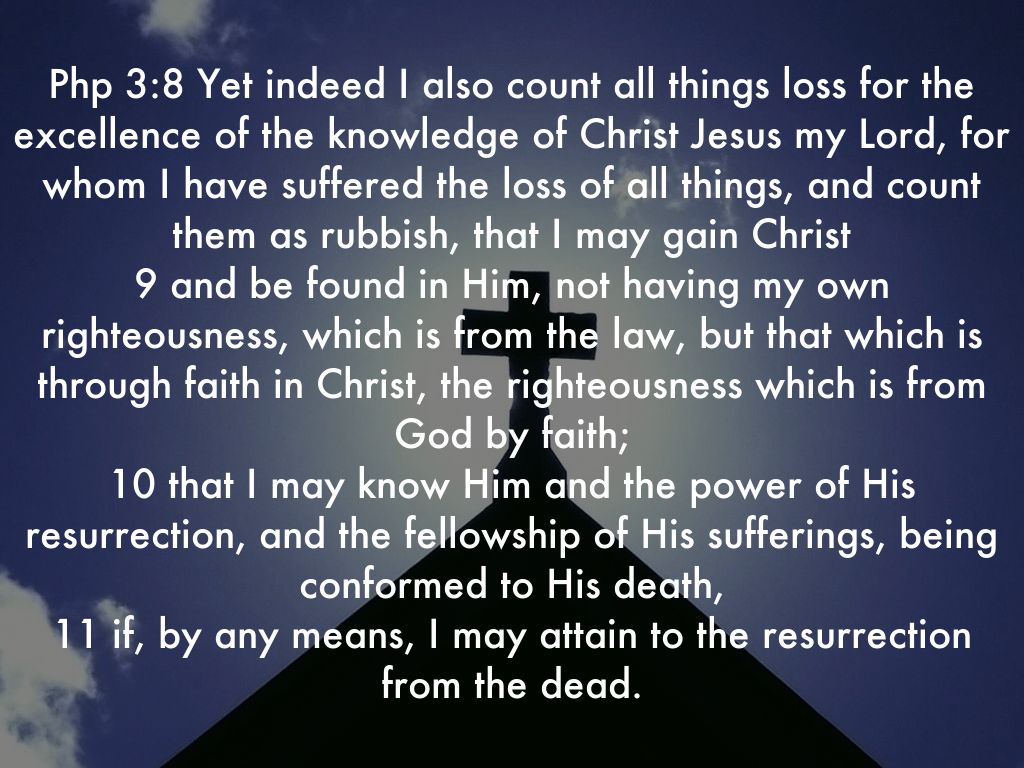 Php 3:8 Yet indeed I also count all things loss for the excellence of the knowledge of Christ Jesus my Lord, for whom I have suffered the loss of all things, and count them as rubbish, that I may gain Christ 9 and be found in Him, not having my own righteousness, which is from the law, but that which is through faith in Christ, the righteousness which is from God by faith; 10 that I may know Him and the power of His resurrection, and the fellowship of His sufferings, being conformed to His death, 11 if, by any means, I may attain to the resurrection from the dead.