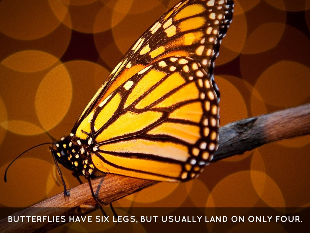BUTTERFLIES HAVE SIX LEGS, BUT USUALLY LAND ON ONLY FOUR.