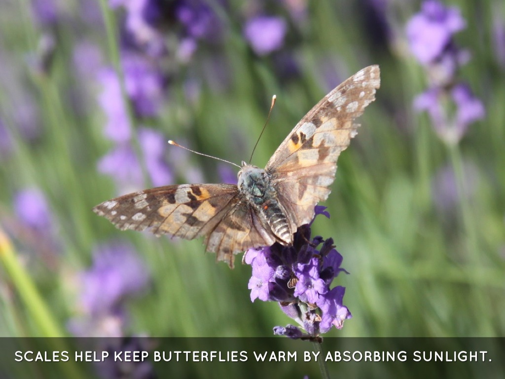 SCALES HELP KEEP BUTTERFLIES WARM BY ABSORBING SUNLIGHT.