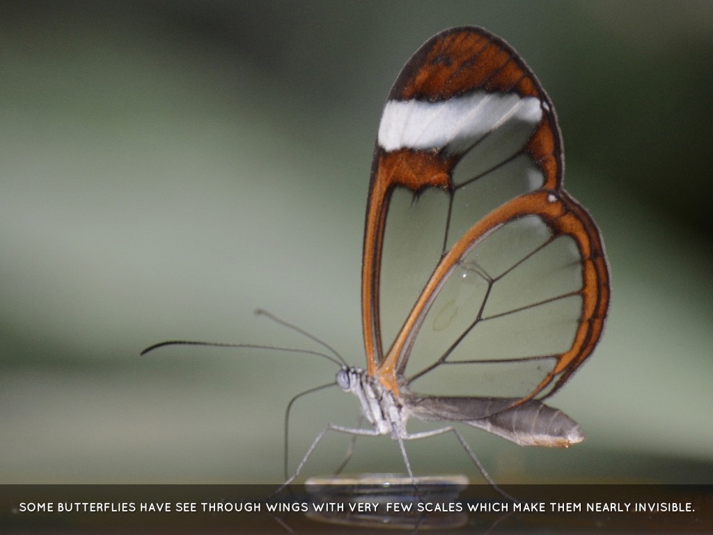 SOME BUTTERFLIES HAVE SEE THROUGH WINGS WITH VERY FEW SCALES WHICH MAKE THEM NEARLY INVISIBLE.