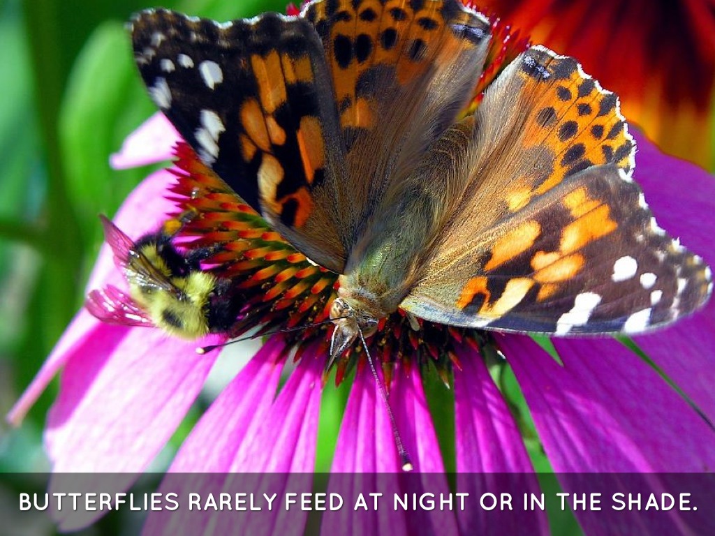BUTTERFLIES RARELY FEED AT NIGHT OR IN THE SHADE.