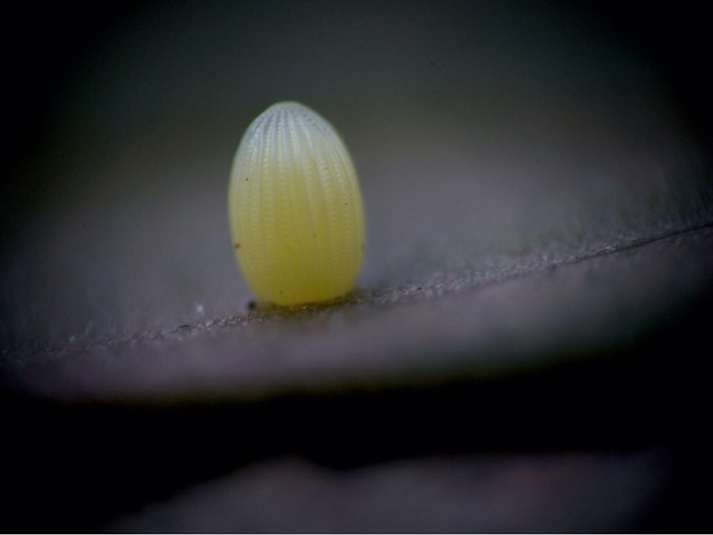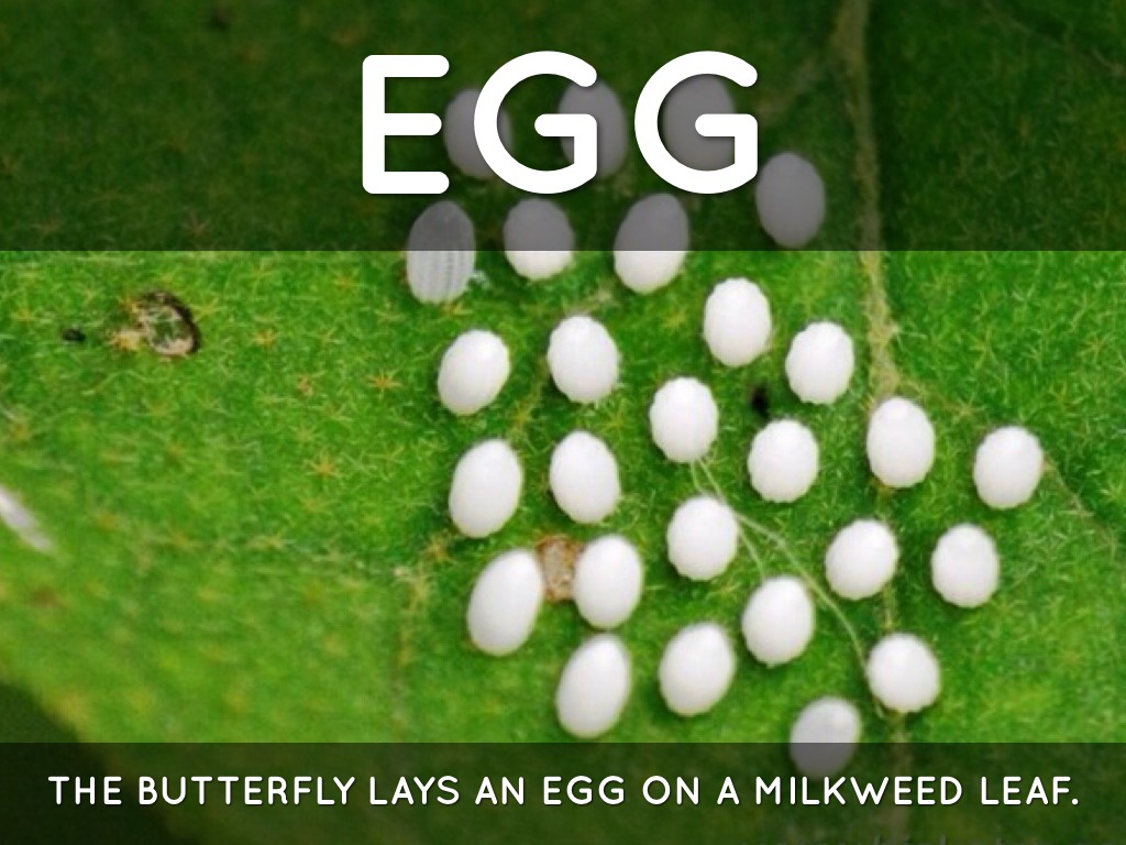 THE BUTTERFLY LAYS AN EGG ON A MILKWEED LEAF.