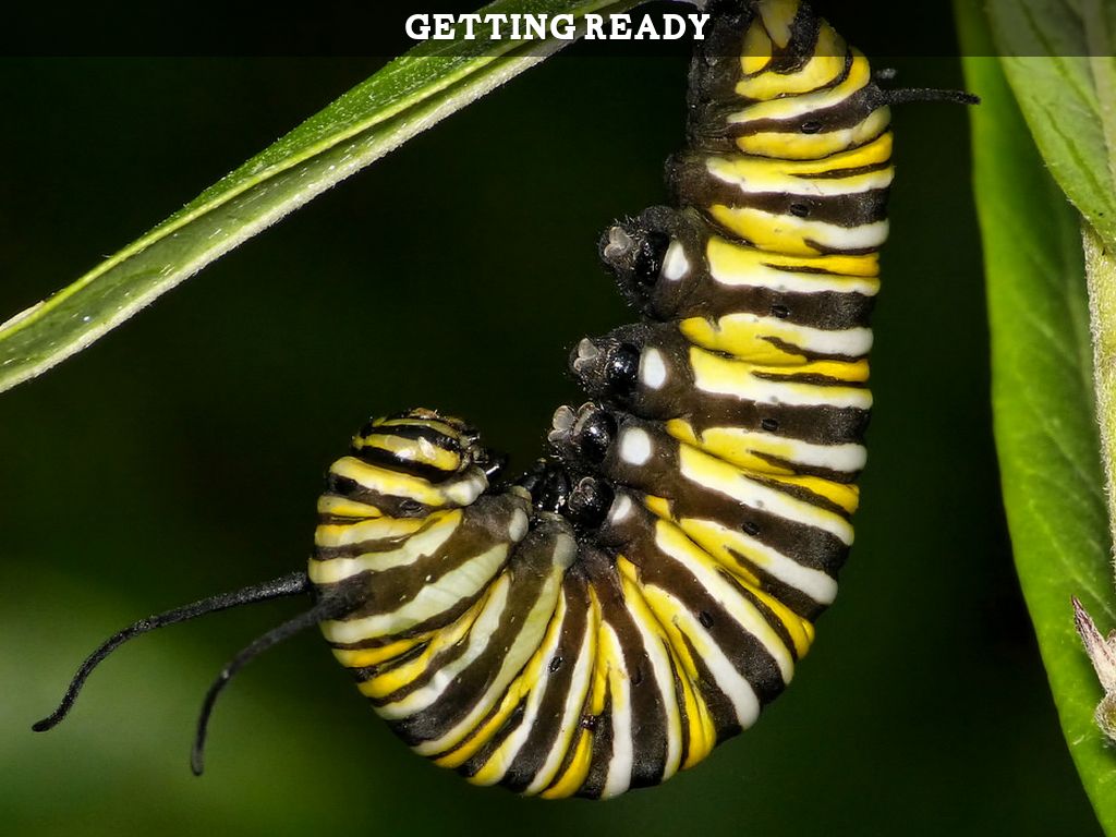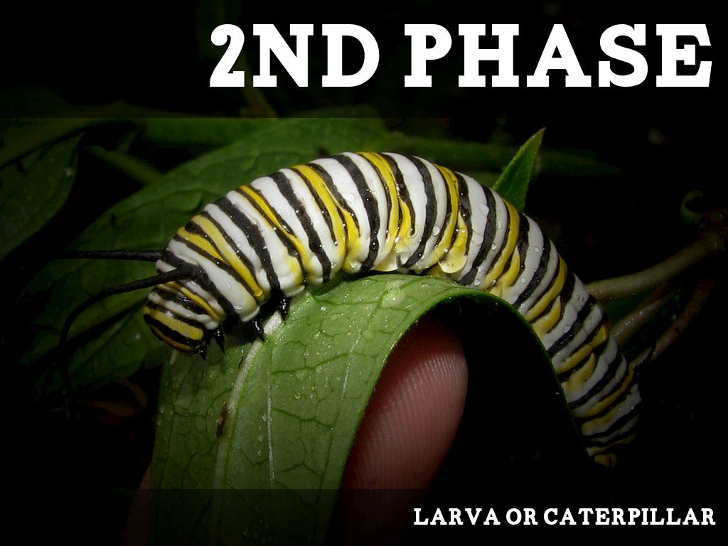 When the egg hatches, a larva emerges. You can also call it a caterpillar. Monarch caterpillars have a distinctive set or yellow, black, and white markings, as you can see in the picture.