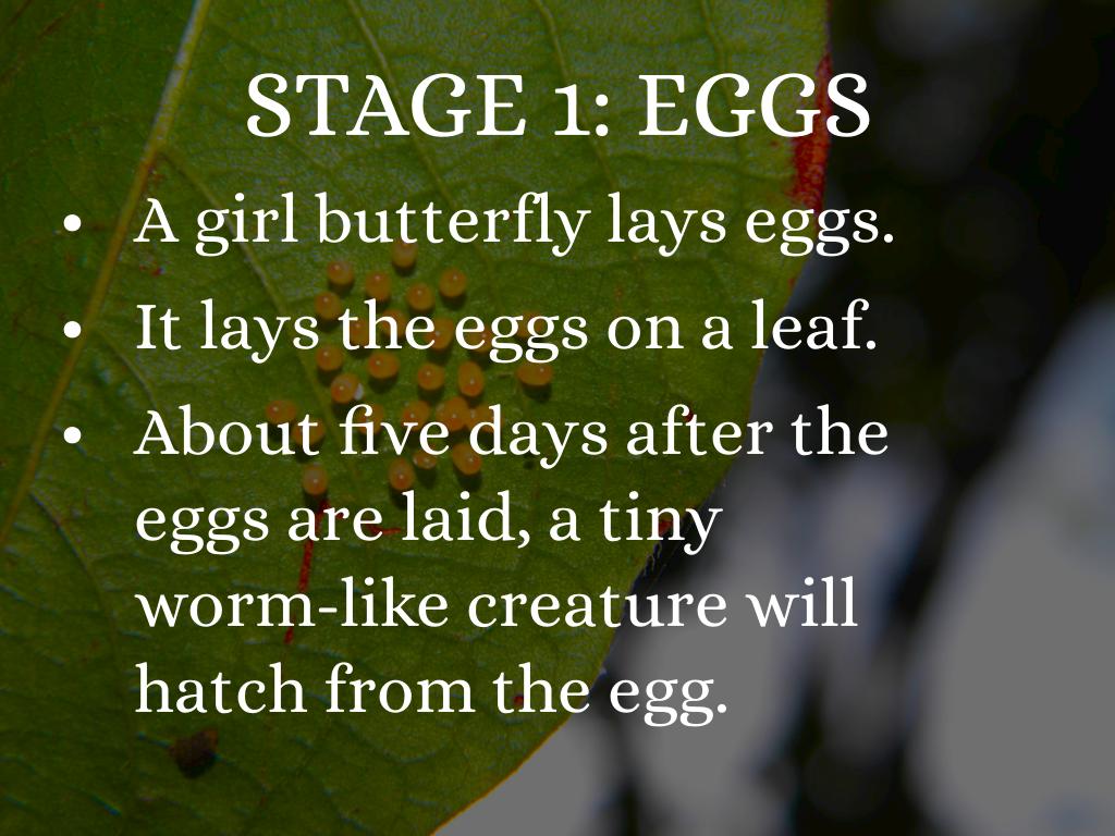 About five days after the eggs are laid, a tiny worm-like creature will hatch from the egg.