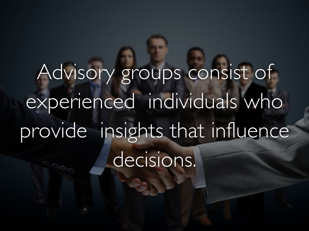 Advisory groups consist of experienced individuals who provide insights that influence decisions.