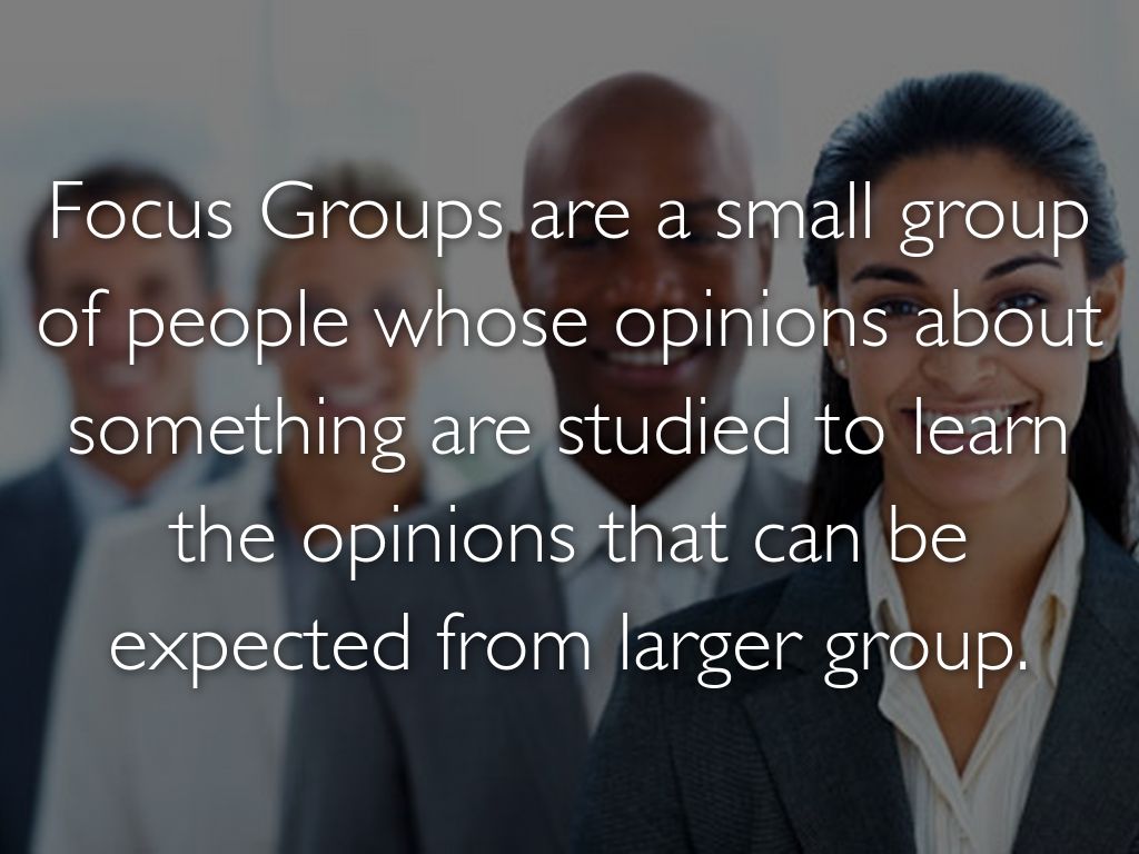 Focus Groups are a small group of people whose opinions about something are studied to learn the opinions that can be expected from larger group.
