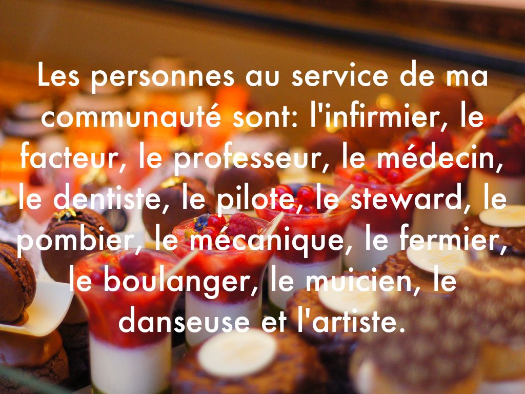 Les personnes au service de ma communauté sont: l'infirmier, le facteur, le professeur, le médecin, le dentiste, le pilote, le steward, le pombier, le mécanique, le fermier, le boulanger, le muicien, le danseuse et l'artiste.