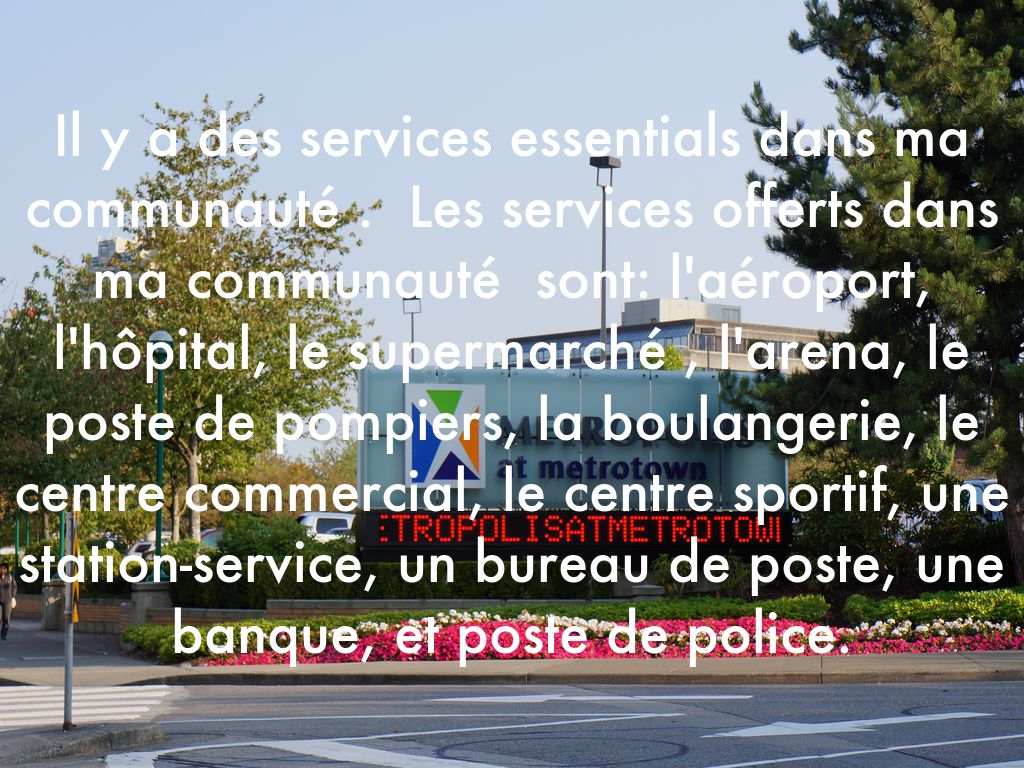 Il y a des services essentials dans ma communauté . Les services offerts dans ma communauté sont: l'aéroport, l'hôpital, le supermarché , l'arena, le poste de pompiers, la boulangerie, le centre commercial, le centre sportif, une station-service, un bureau de poste, une banque, et poste de police.