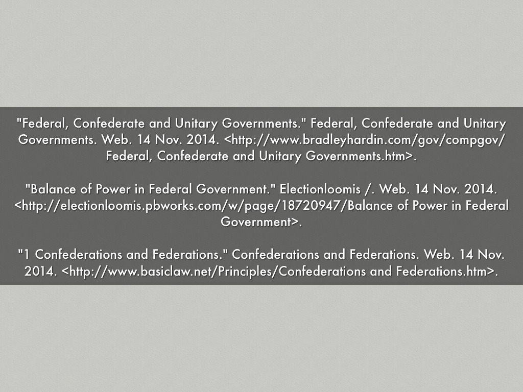 "Federal, Confederate and Unitary Governments." Federal, Confederate and Unitary Governments. Web. 14 Nov. 2014. .