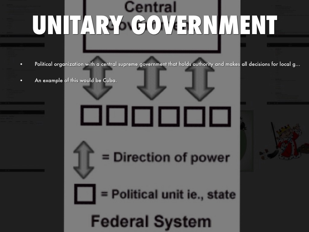 - Political organization with a central supreme government that holds authority and makes all decisions for local goverenements.