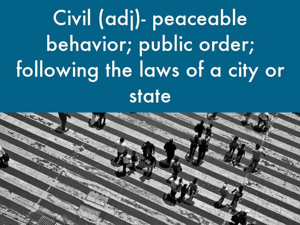 Civil (adj)- peaceable behavior; public order; following the laws of a city or state