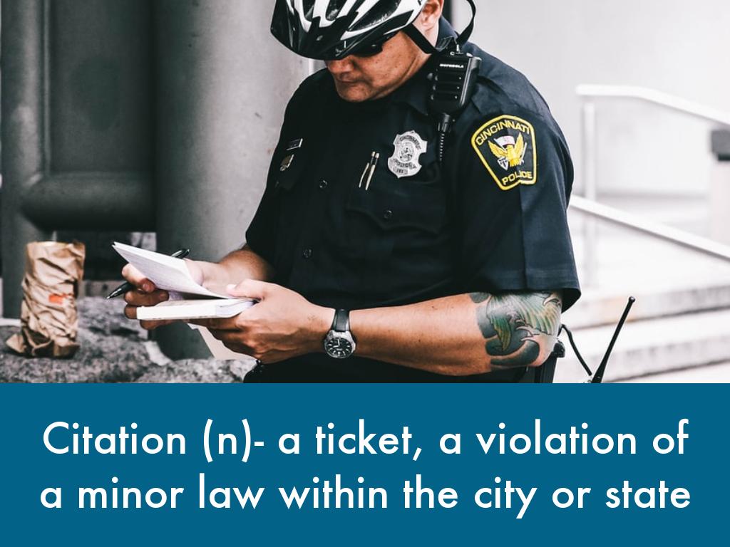 Citation (n)- a ticket, a violation of a minor law within the city or state