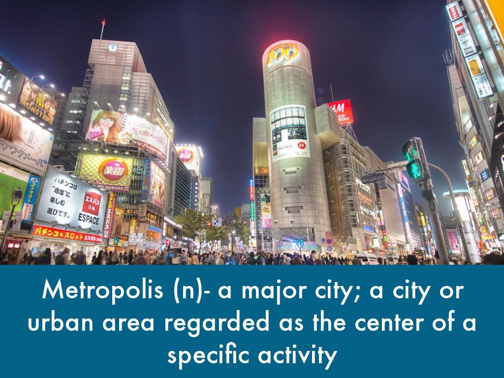 Metropolis (n)- a major city; a city or urban area regarded as the center of a specific activity