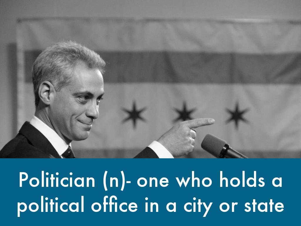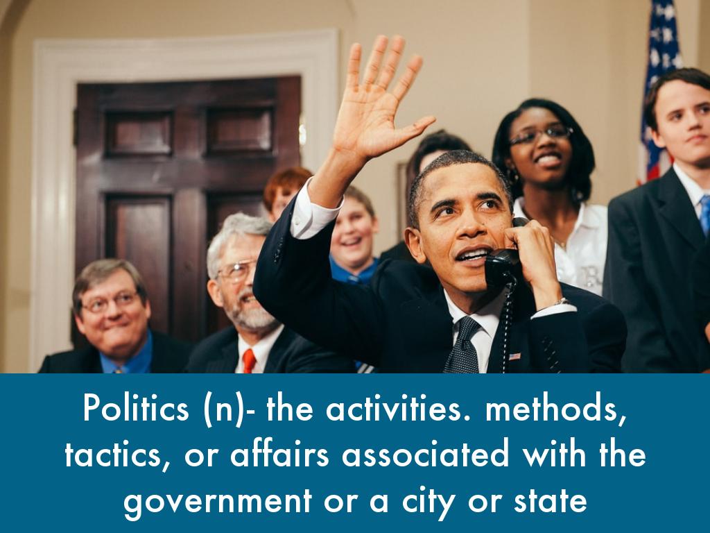 Politics (n)- the activities. methods, tactics, or affairs associated with the government or a city or state