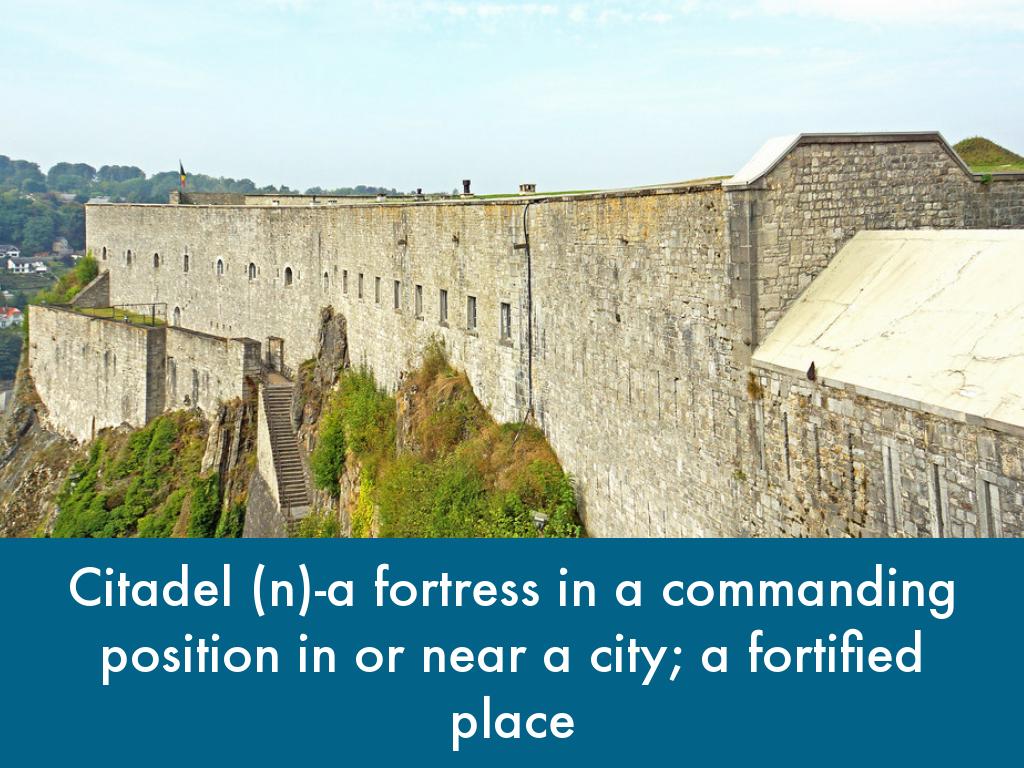 Citadel (n)-a fortress in a commanding position in or near a city; a fortified place