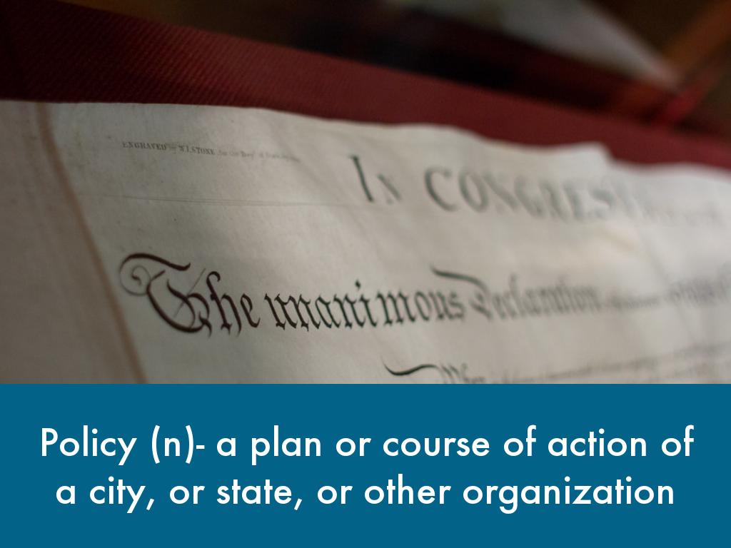 Policy (n)- a plan or course of action of a city, or state, or other organization