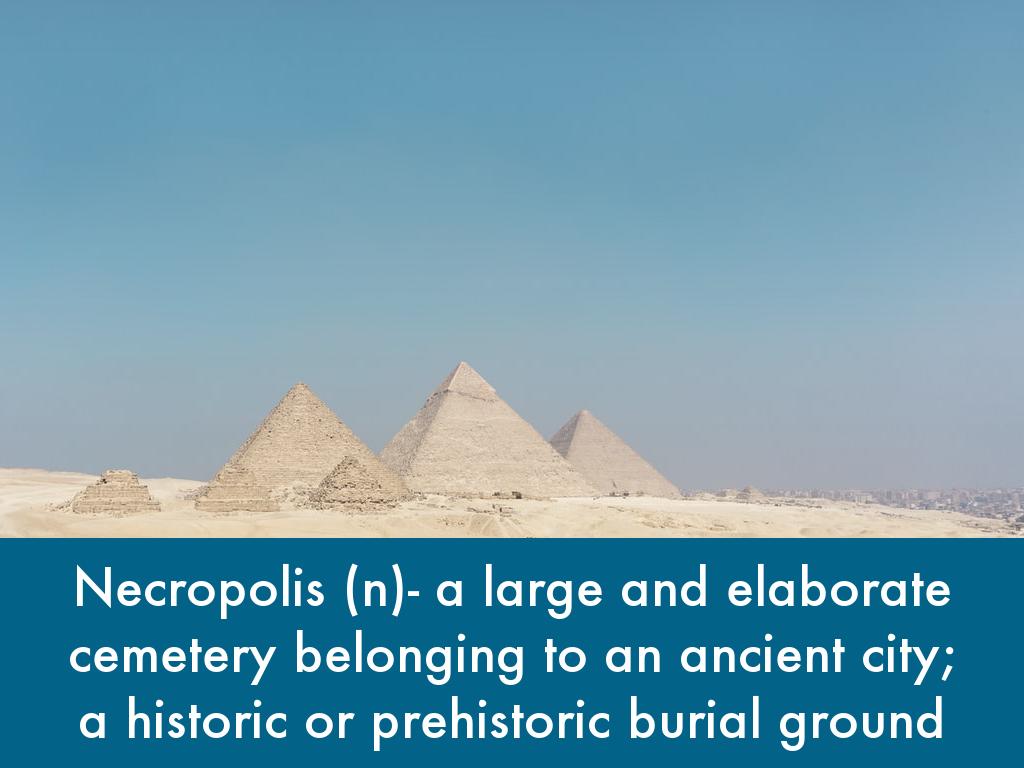 Necropolis (n)- a large and elaborate cemetery belonging to an ancient city; a historic or prehistoric burial ground