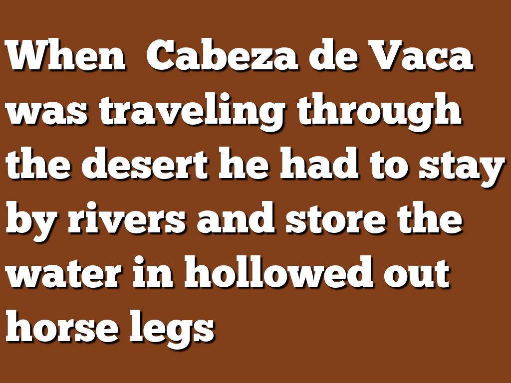 When Cabeza de Vaca was traveling through the desert he had to stay by rivers and store the water in hollowed out horse legs