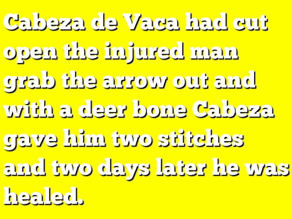 Cabeza de Vaca had cut open the injured man grab the arrow out and with a deer bone Cabeza gave him two stitches and two days later he was healed.