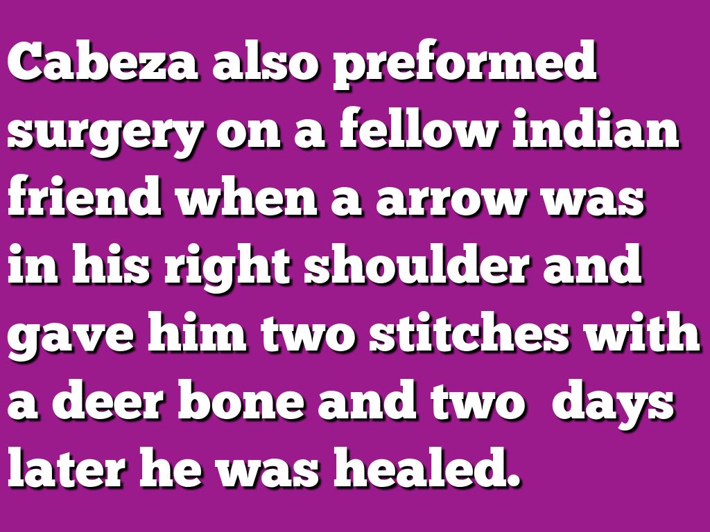 Cabeza also preformed surgery on a fellow indian friend when a arrow was in his right shoulder and gave him two stitches with a deer bone and two days later he was healed.