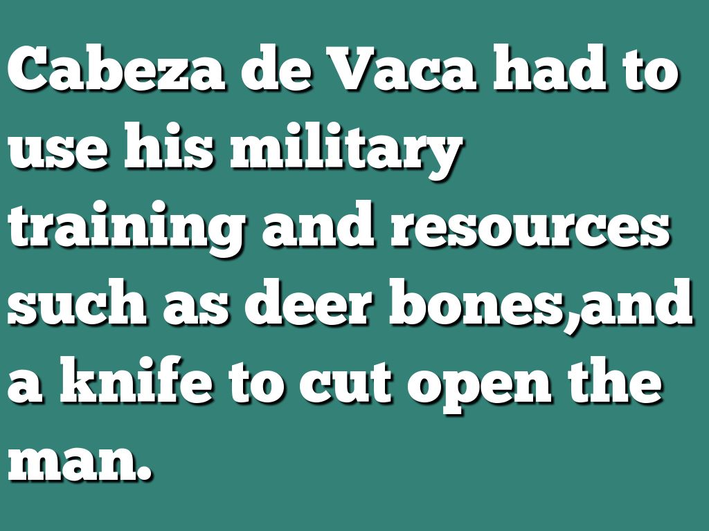 Cabeza de Vaca had to use his military training and resources such as deer bones,and a knife to cut open the man.