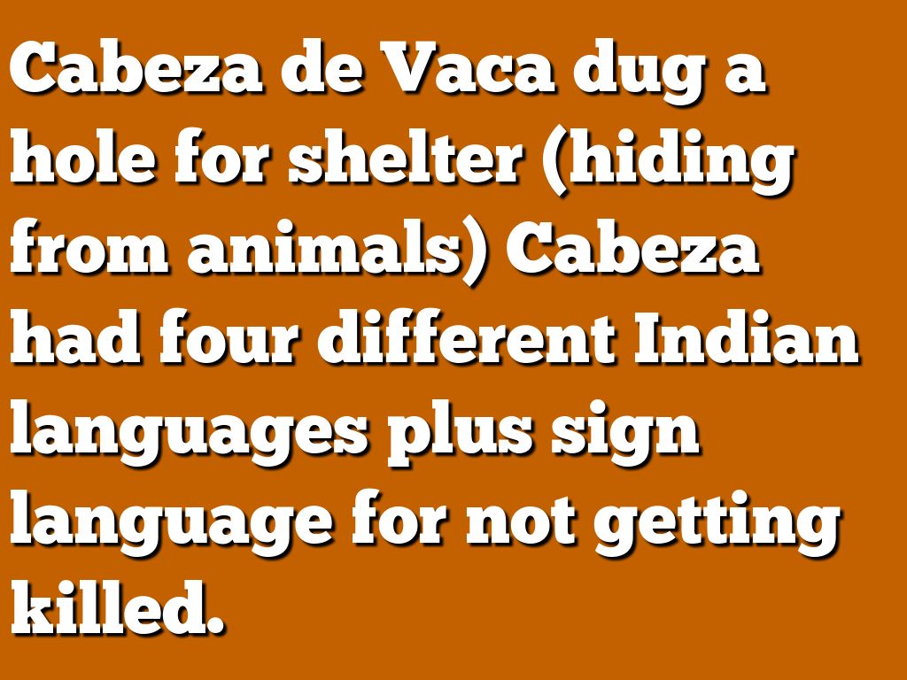 Cabeza de Vaca dug a hole for shelter (hiding from animals) Cabeza had four different Indian languages plus sign language for not getting killed.