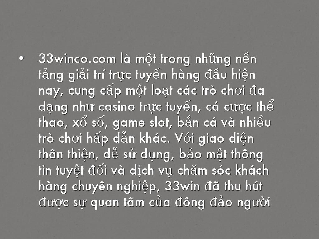 33winco.com là một trong những nền tảng giải trí trực tuyến hàng đầu hiện nay, cung cấp một loạt các trò chơi đa dạng như casino trực tuyến, cá cược thể thao, xổ số, game slot, bắn cá và nhiều trò chơi hấp dẫn khác. Với giao diện thân thiện, dễ sử dụng, bảo mật thông tin tuyệt đối và dịch vụ chăm sóc khách hàng chuyên nghiệp, 33win đã thu hút được sự quan tâm của đông đảo người chơi.