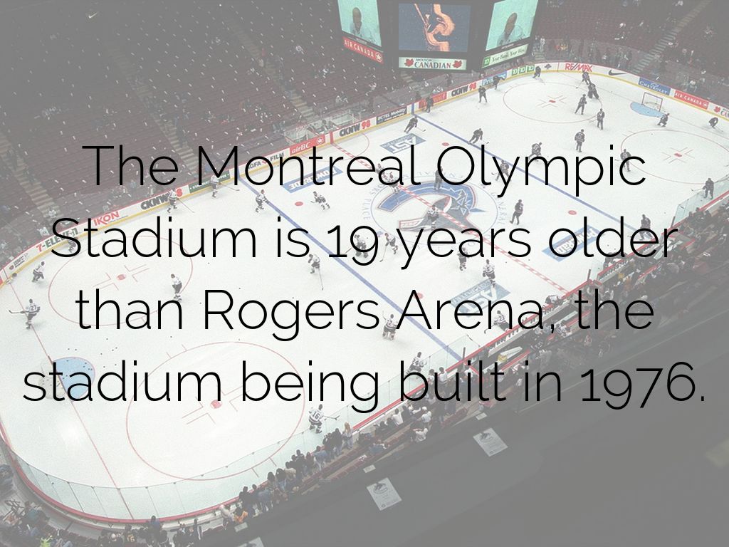 The Montreal Olympic Stadium is 19 years older than Rogers Arena, the stadium being built in 1976.