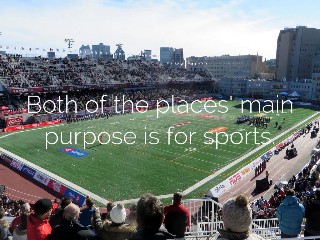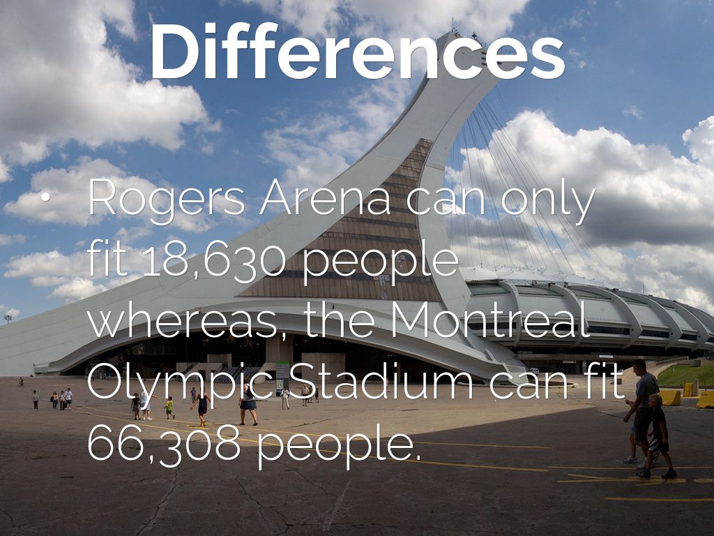 Rogers Arena can only fit 18,630 people whereas, the Montreal Olympic Stadium can fit 66,308 people.