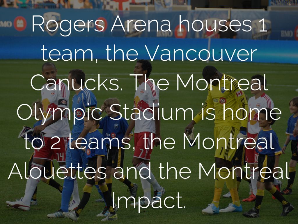 Rogers Arena houses 1 team, the Vancouver Canucks. The Montreal Olympic Stadium is home to 2 teams, the Montreal Alouettes and the Montreal Impact.