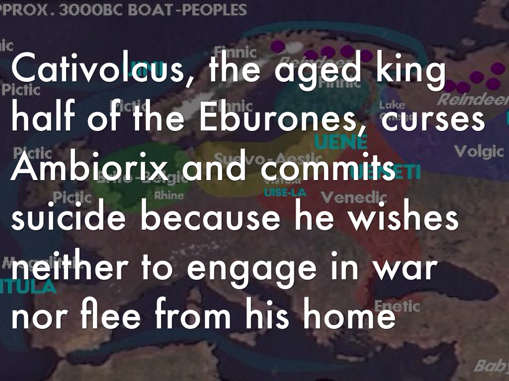 Cativolcus, the aged king half of the Eburones, curses Ambiorix and commits suicide because he wishes neither to engage in war nor flee from his home