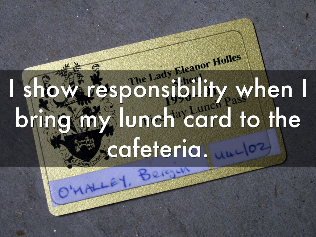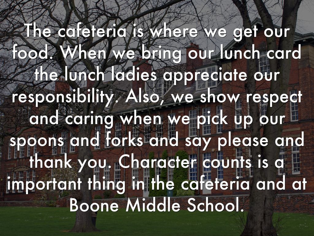 The cafeteria is where we get our food. When we bring our lunch card the lunch ladies appreciate our responsibility. Also, we show respect and caring when we pick up our spoons and forks and say please and thank you. Character counts is a important thing in the cafeteria and at Boone Middle School.