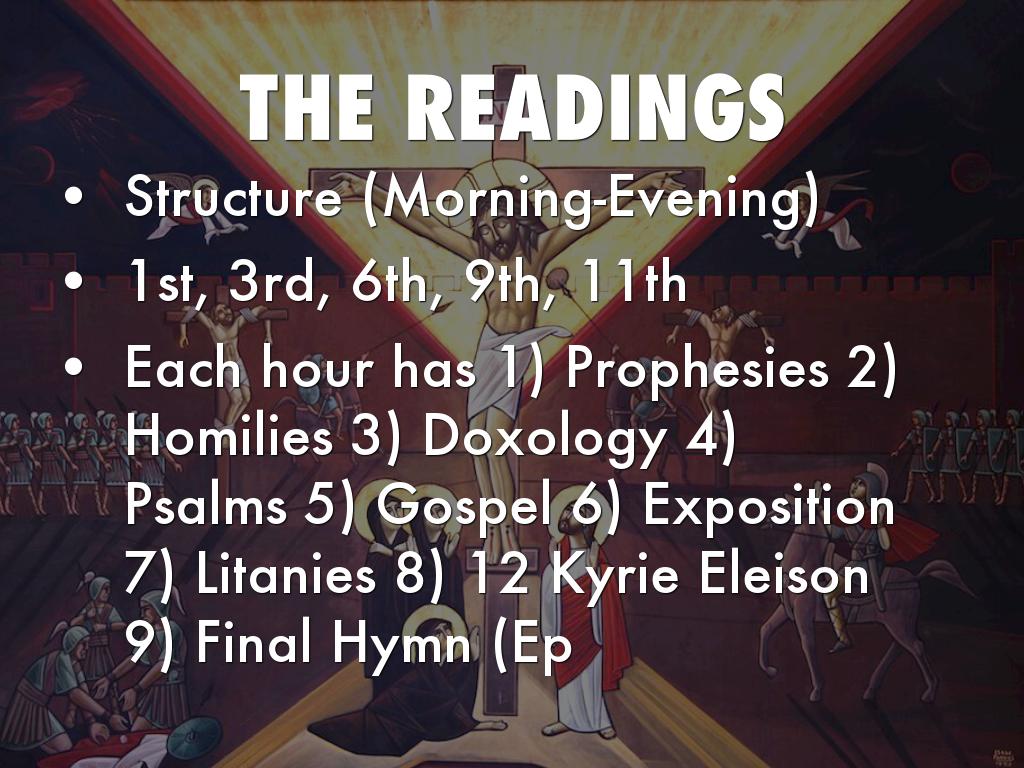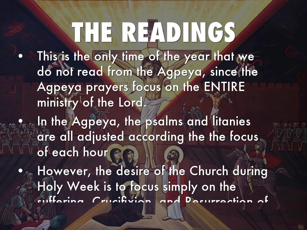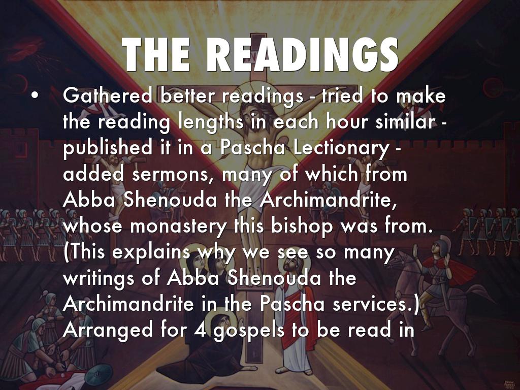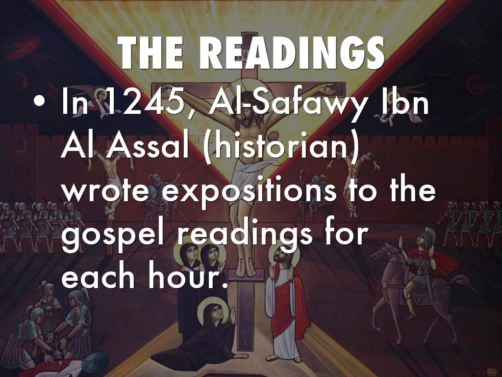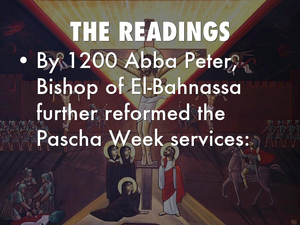 The first official selection of readings seem to be made by Pope Gabriel (70th Patriarch from 1131-1145) who selected some of the prophesies from the OT, Psalms, and NT that memorialized these events in the last week of His Ministry. He then distributed them among the daily hours and compiled it into the Holy Pascha book.