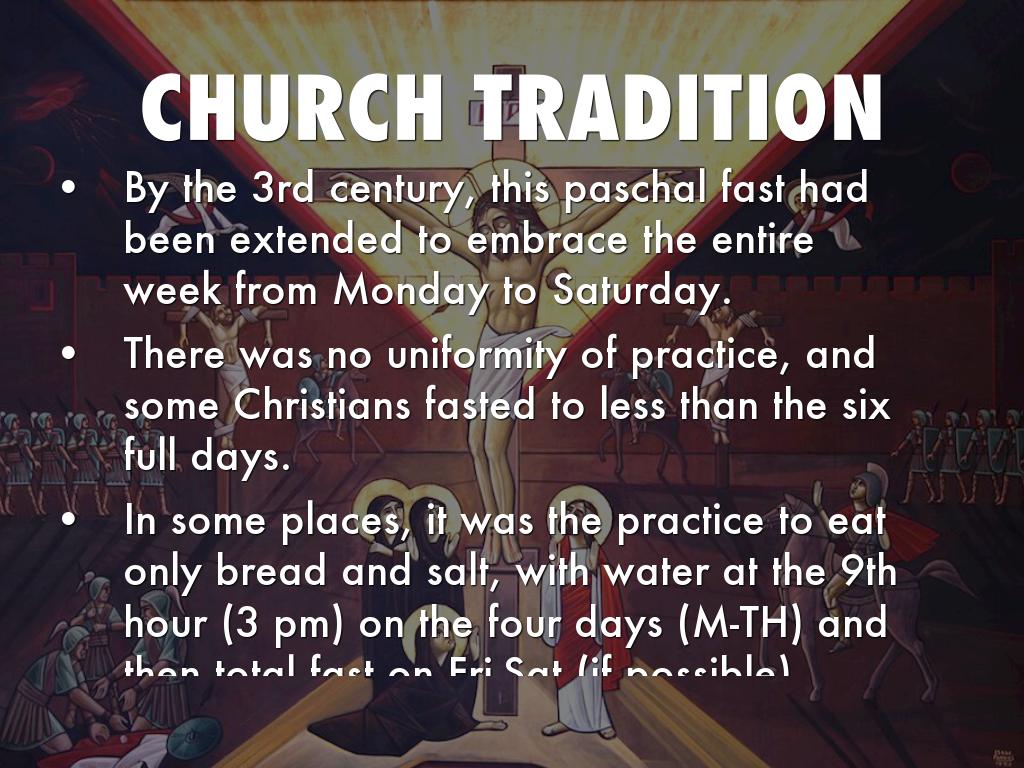 By the 3rd century, this paschal fast had been extended to embrace the entire week from Monday to Saturday.