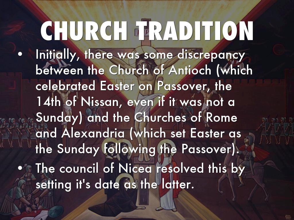 Initially, there was some discrepancy between the Church of Antioch (which celebrated Easter on Passover, the 14th of Nissan, even if it was not a Sunday) and the Churches of Rome and Alexandria (which set Easter as the Sunday following the Passover).