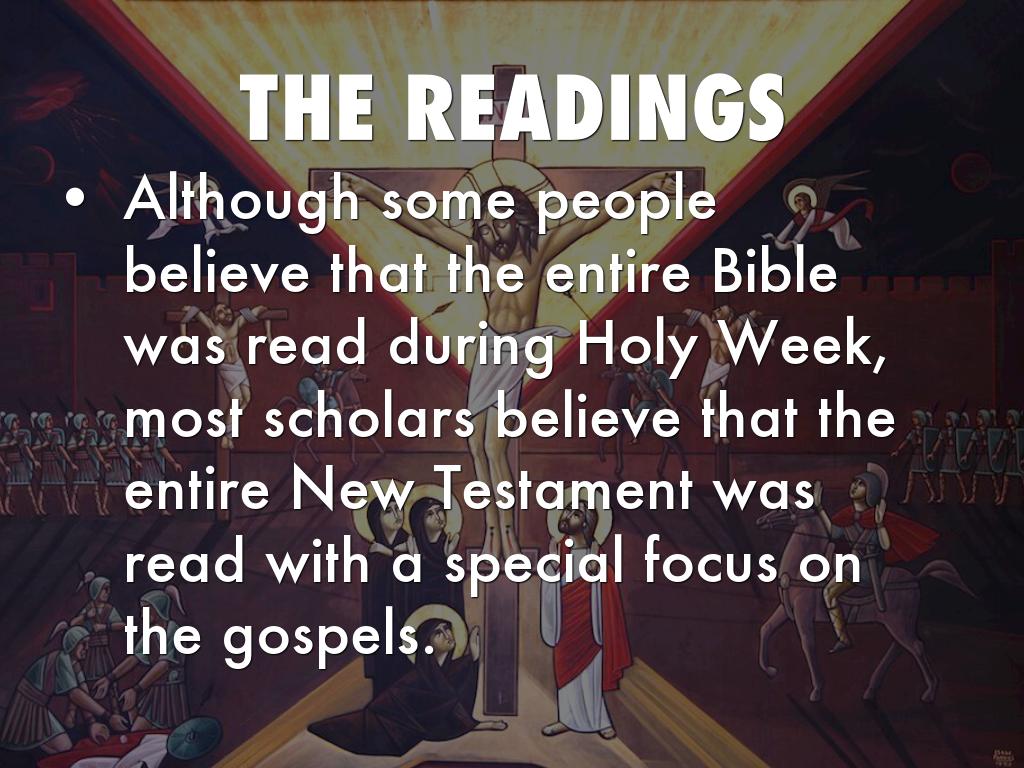 Although some people believe that the entire Bible was read during Holy Week, most scholars believe that the entire New Testament was read with a special focus on the gospels.