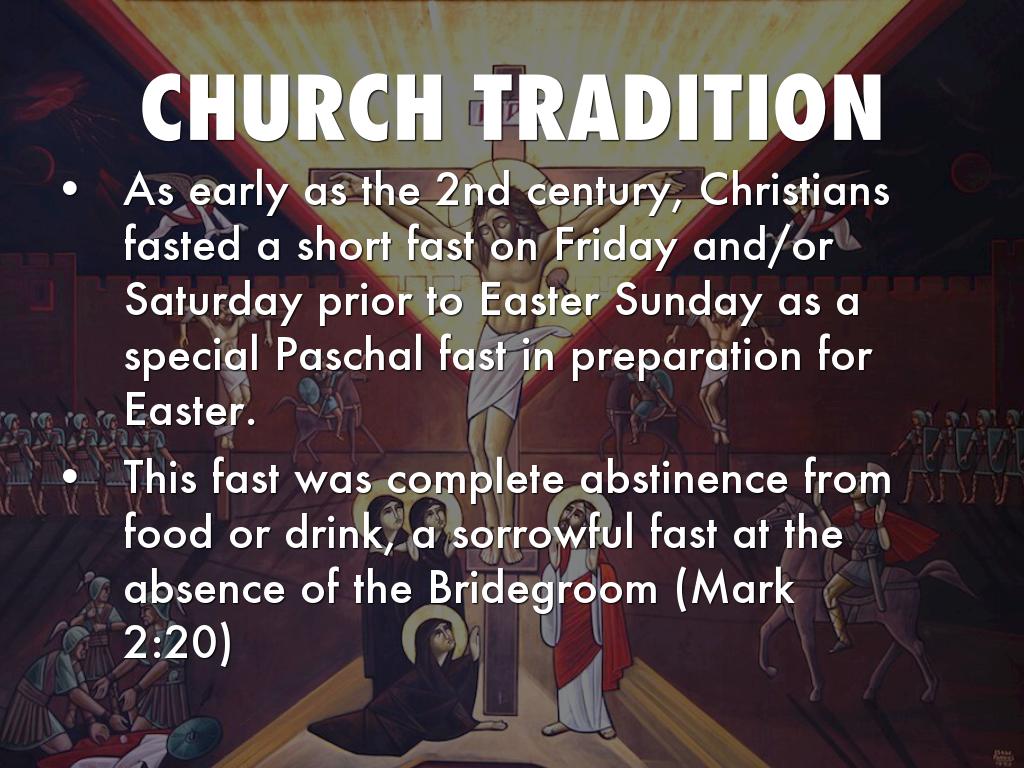 As early as the 2nd century, Christians fasted a short fast on Friday and/or Saturday prior to Easter Sunday as a special Paschal fast in preparation for Easter.