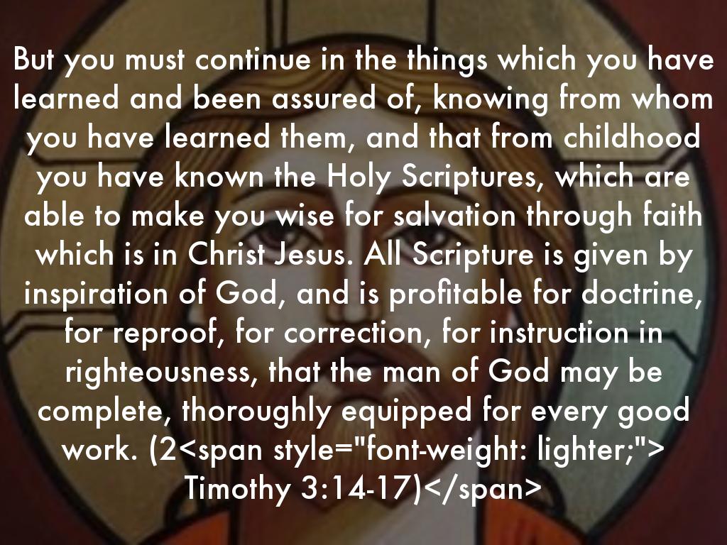 But you must continue in the things which you have learned and been assured of, knowing from whom you have learned them, and that from childhood you have known the Holy Scriptures, which are able to make you wise for salvation through faith which is in Christ Jesus. All Scripture is given by inspiration of God, and is profitable for doctrine, for reproof, for correction, for instruction in righteousness, that the man of God may be complete, thoroughly equipped for every good work. (2 Timothy 3:14-17)