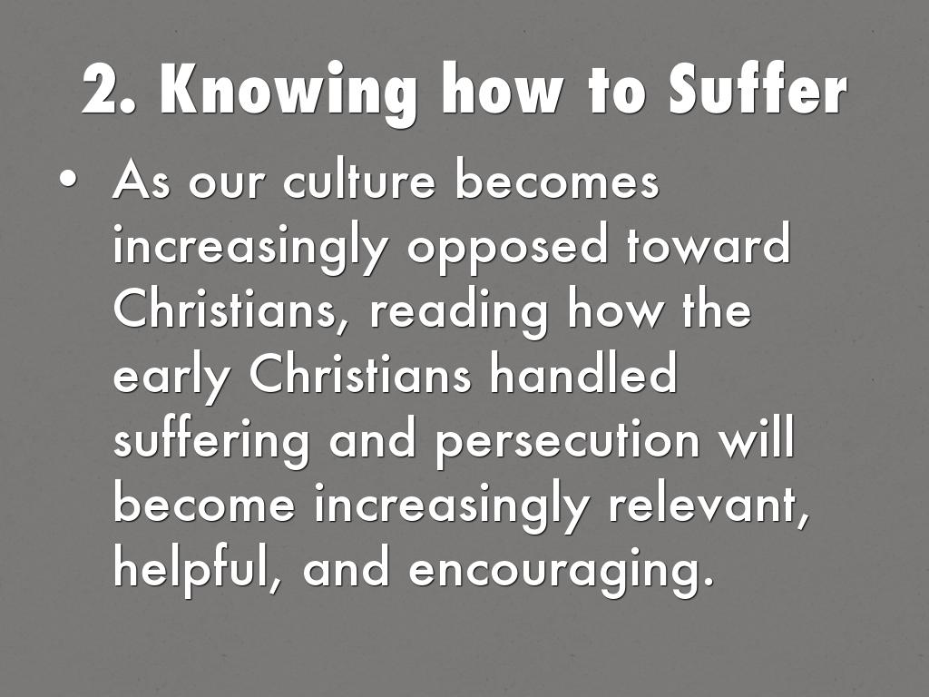 - As our culture becomes increasingly opposed toward Christians, reading how the early Christians handled suffering and persecution will become increasingly relevant, helpful, and encouraging.